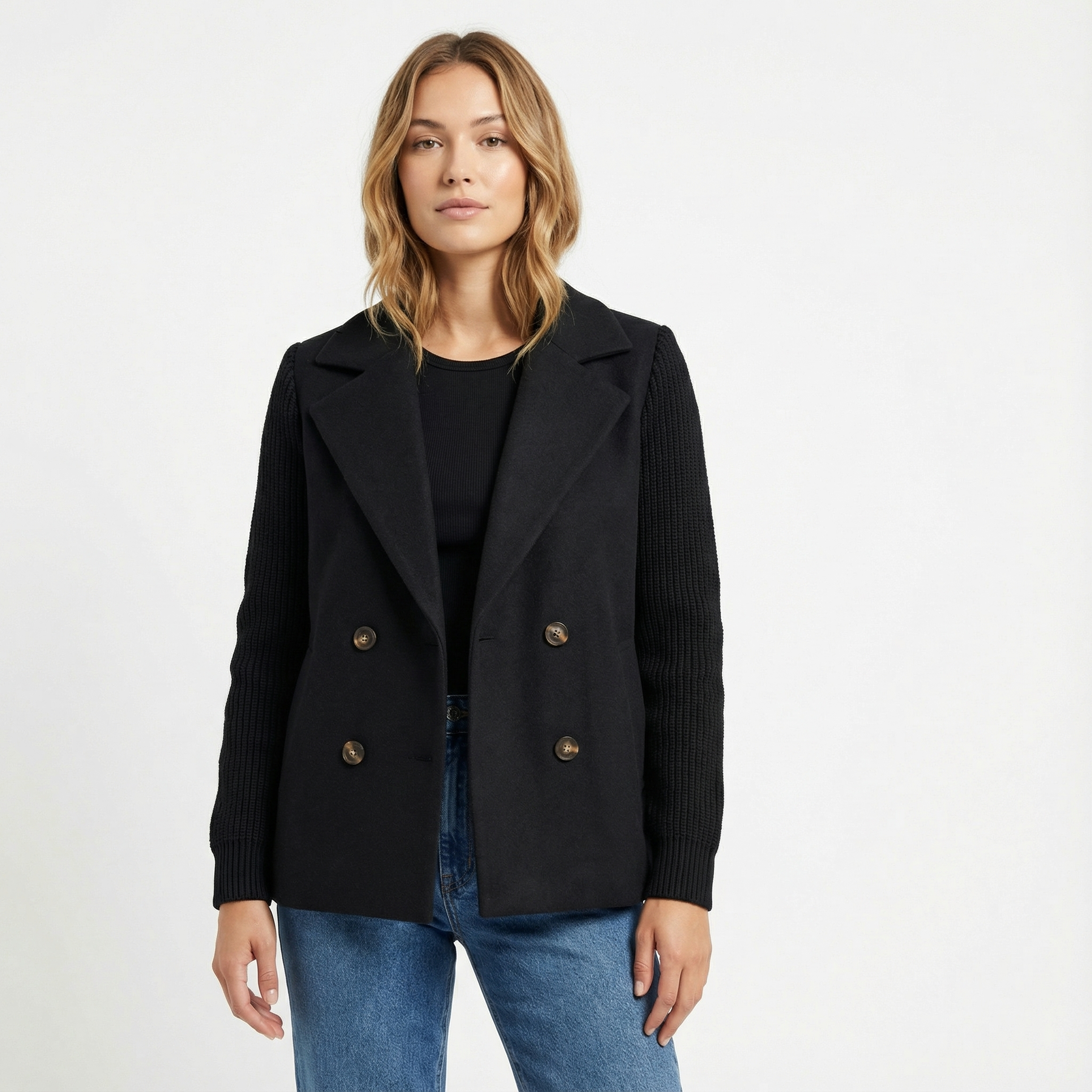 The Megan Knit-Sleeve Blazer blends structured tailoring with soft knit sleeves for a comfortable contrast look. Its mixed textures create a relaxed yet refined finish ideal for everyday wear.